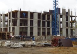 В настоящее время в корпусе номер 1 строители производят комплексные работы по бетонированию на уровне четвертого этажа. В корпусе номер 2 аналогичные работы производятся на уровне второго этажа, в корпусе номер 3 - на уровне пятого, в корпусе номер 4 - на уровне первого и в корпусе номер 5 - на уровне седьмого этажа.